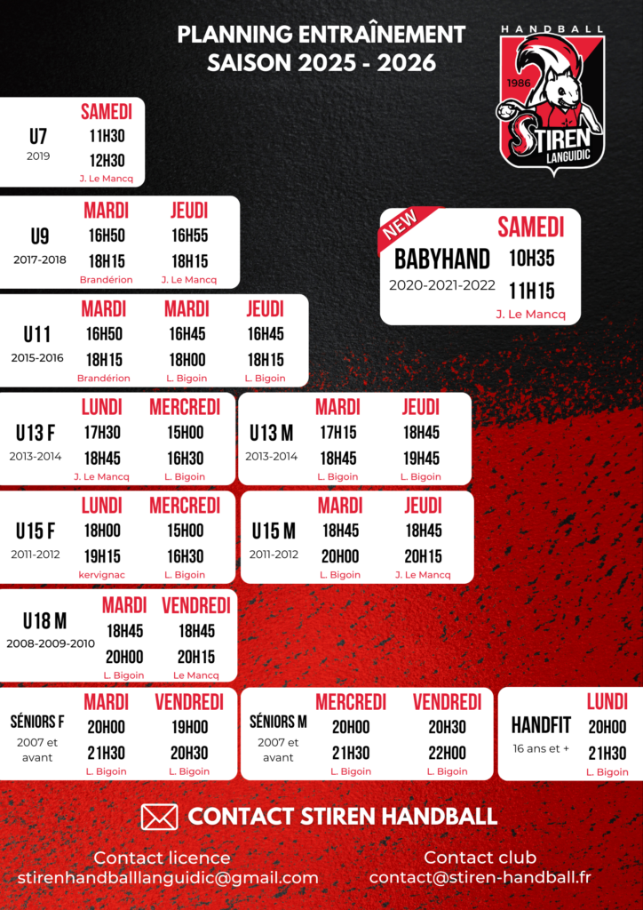 Horaire d’entraînement Créneaux d’entraînement Voici le planning des créneaux d’entraînement de toutes les équipes de la Stiren Handball.